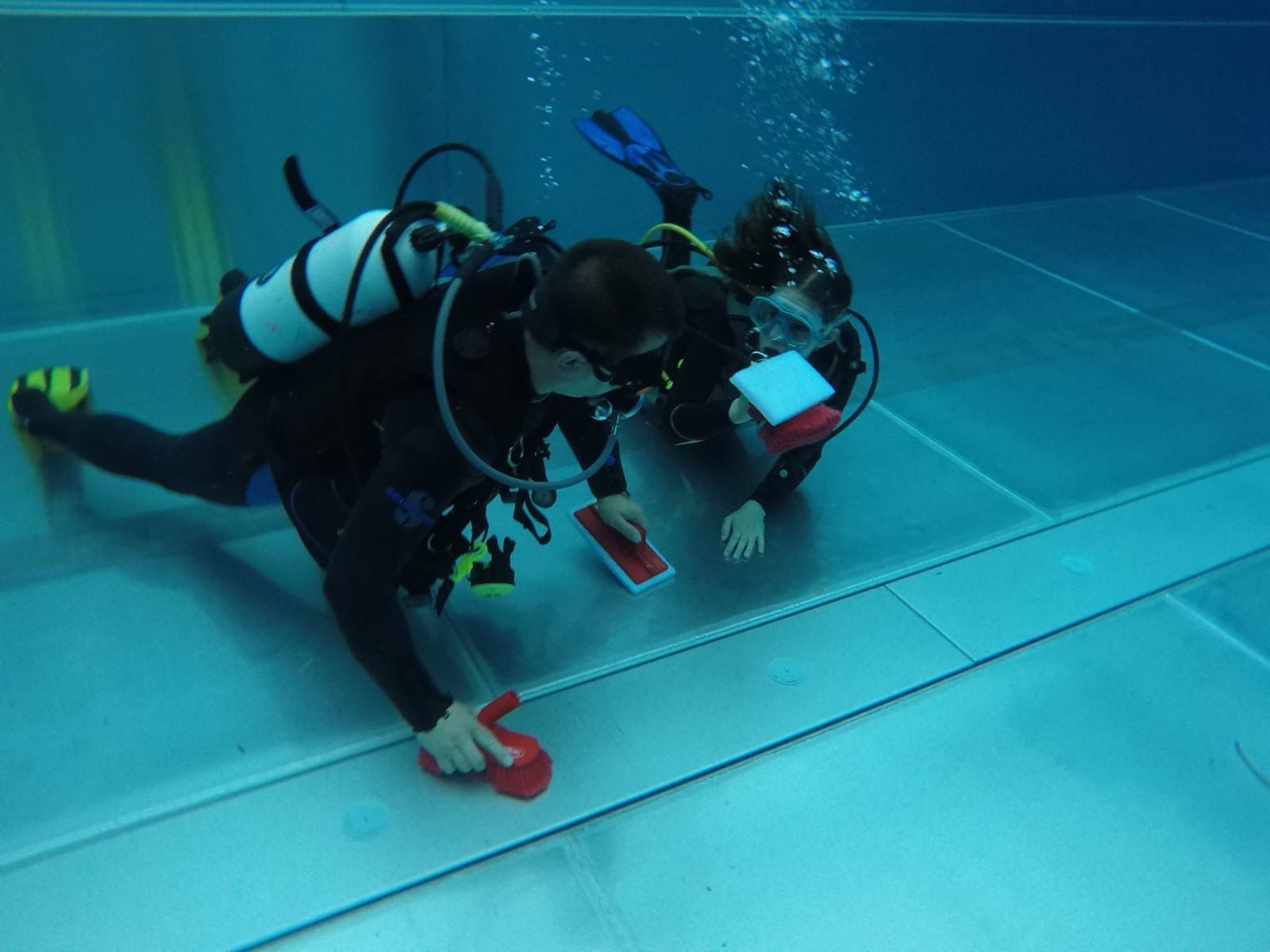 In voller Ausrüstung mit Schwamm und Bürste werden die letzten Stellen auf dem Beckenboden, sowie unter den Treppen geschrubbt.